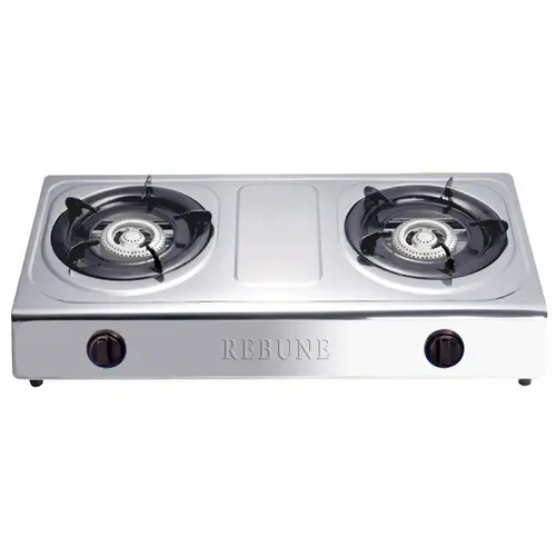 *2 burner gas stove *Panel Material: Stainless Steel *Panel Thickness:0.3 mm *Ignition Mode: Automatic *Ignition Burner Material: cast iron(sliver) *Burner Size:100mm,100mm *Gas type:LPG