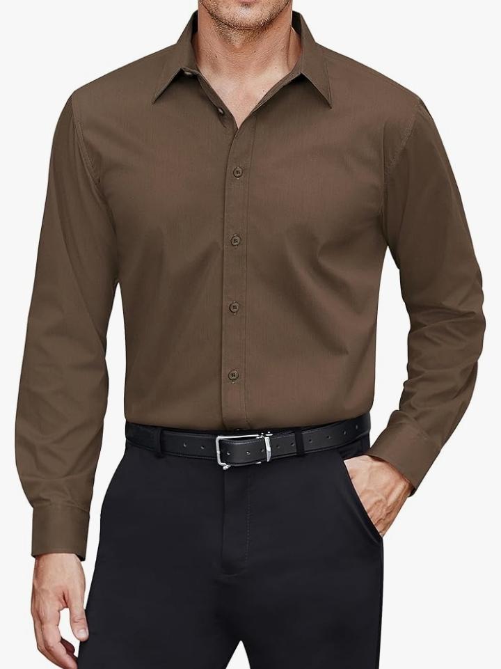 This Brown Button Down Formal,Long sleeve,Lightweight,regular fit,Button down business shirts with collar and solid shirts. Occasion:Men's casual business solid button shirt suitable for all occasions and seasons like holiday, brithday, beach, Casual, Informal Business, Work, Vacation, Date, Wedding and Travel, Classsic shirts for men will make you feel handsome and elegant when you wear it.