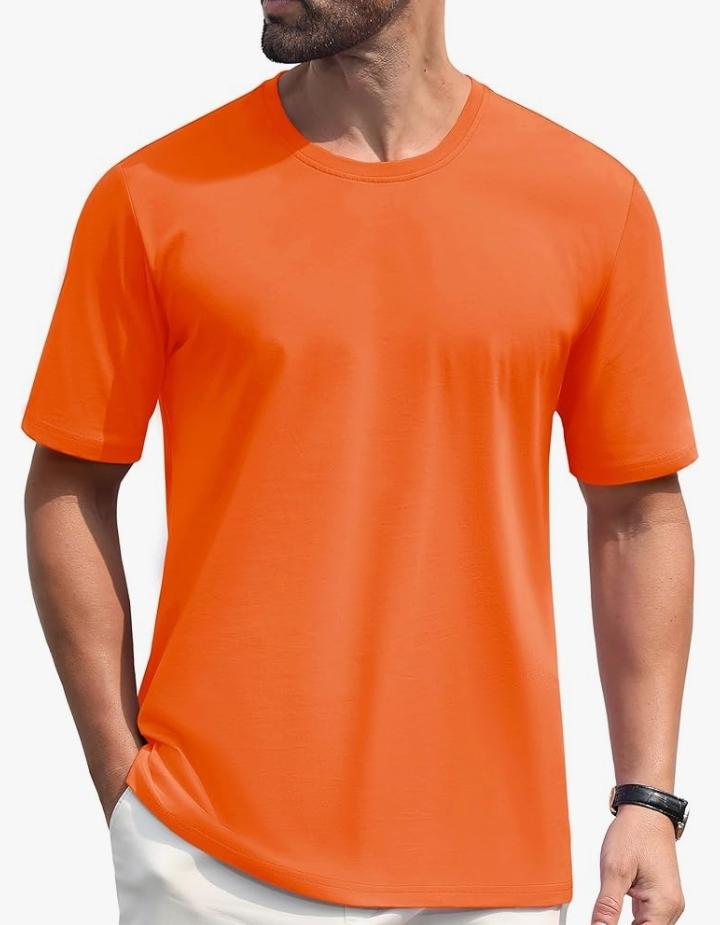 The ultra-soft, 100% cotton Orange Plain T-shirt in 6.1.oz. jersey is a great weight that's beefy indeed. It feels soft against your skin and will continue to feel that way for a long time, getting softer with every washing.